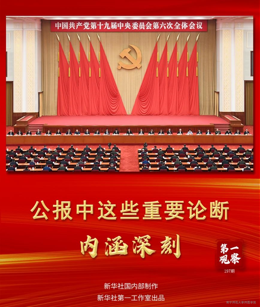 中国共产党第十九届中央委员会第六次全体会议11月8日至11日在北京举行,这是在重要历史关头召开的一次具有重大历史意义的会议。7000余字的会议公报有许多重要论断、提法,内涵深刻。