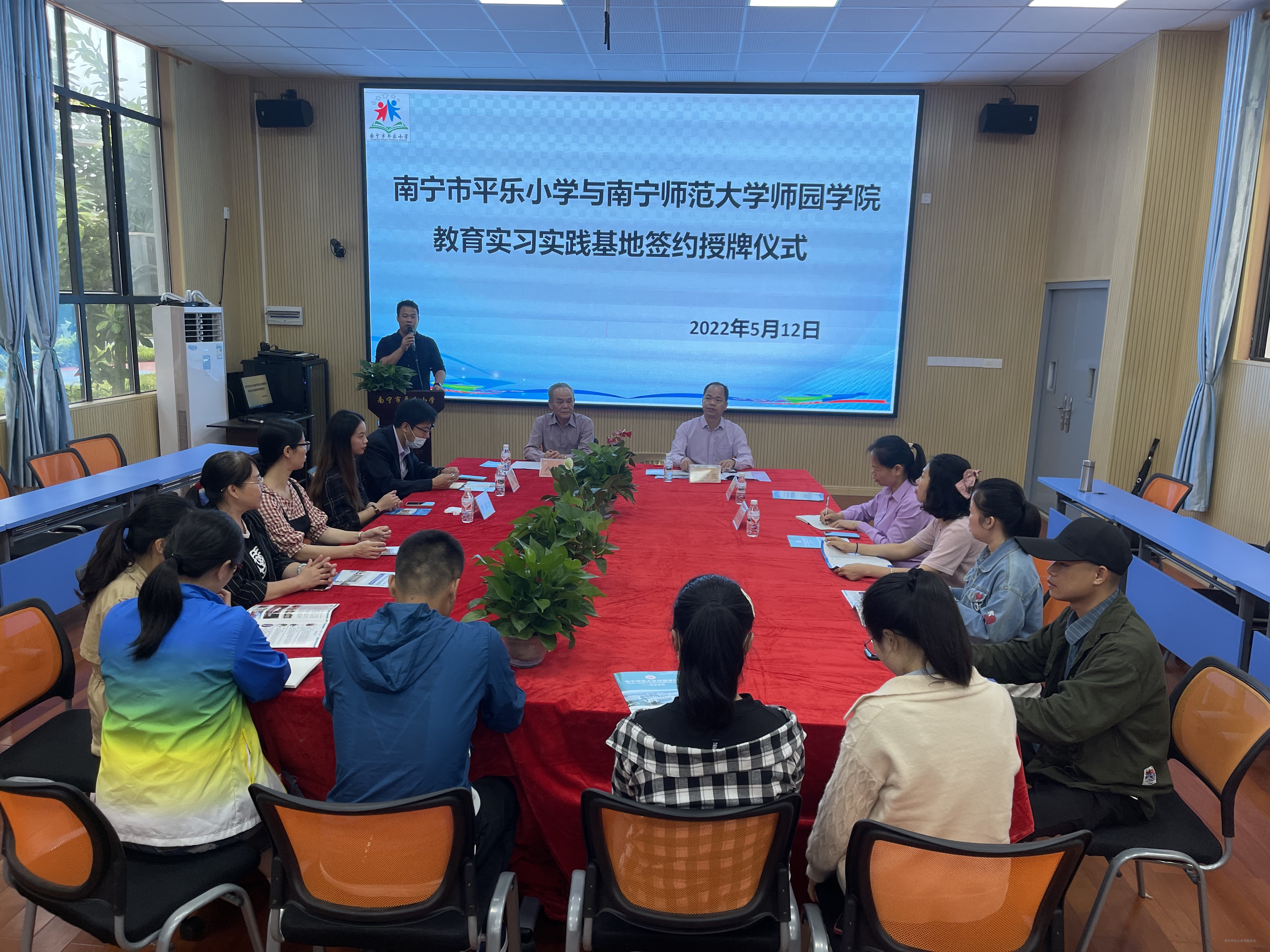 为不断充实我院师范生实习见习平台,推动学院应用型人才培养,5月12日上午,我院在南宁市平乐小学举行教育实习实践基地签约仪式。学院副院长卢敏秋,艺术系主任韩聪与南宁市平乐小学校长黄登兆一行参加签约仪式。