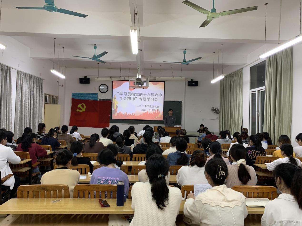 11月21日晚,中文系学生党支部在教学楼3-307教室召开专题组织生活会,专题学习党的十九届六中全会精神。中文系学生党支部书记吴金翘和全体在校生党员参加会议。