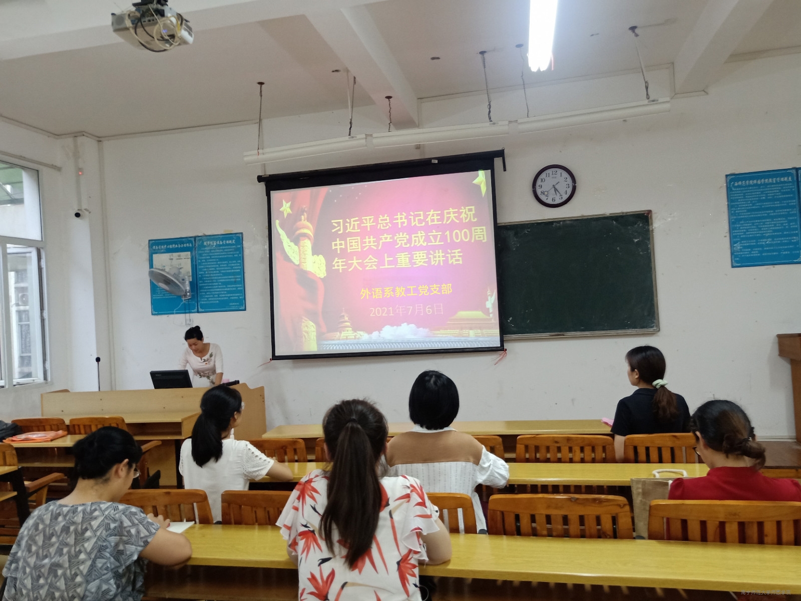 7月7日,外语系教工党支部在教学楼3-202教室召开党史学习教育专题组织生活会,围绕学习贯彻习近平总书记在庆祝中国共产党成立100周年大会上的重要讲话精神、习近平总书记视察广西时的重要讲话精神和重要指示精神等方面展开学习。