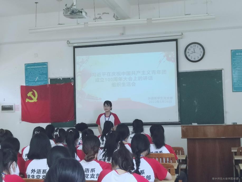 外语系学生党支部书记韦博文老师强调,青年党员及团员要肩负起民族振兴的责任,要用党的科学理论武装头脑,要用党的初心使命改造思想,要用党的光辉旗帜指引方向,自觉在行动上践行青春使命。