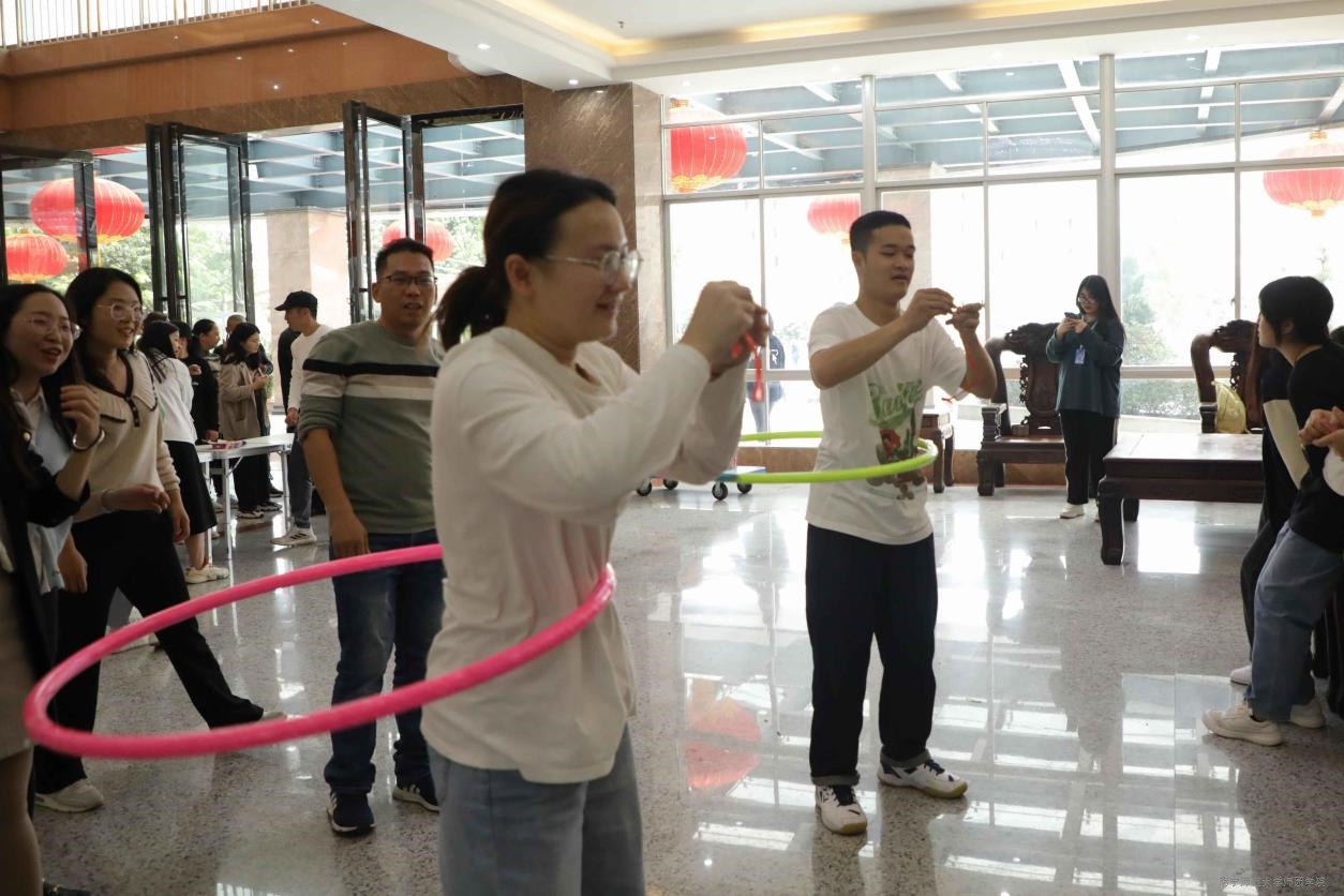 本次游园活动以趣味游戏的形式进行,包含拉力绳夺宝、夹乒乓球、套圈、挤眉弄眼吃饼干等共12个项目。在拉力绳夺宝游戏中,参赛老师们勇往直前,努力挣脱束缚夺取“宝藏”,最终赢得丰厚奖品;不顾表情管理的挤眉弄眼吃饼干游戏更是精彩纷呈,参赛老师各显其招,头和脸分别调动,每一帧表情都值得记录。活动现场,欢呼声、喝彩声不绝于耳,处处洋溢着浓浓的节日氛围,让学院全体教职工共度了一个充实、欢乐、美好的春日。