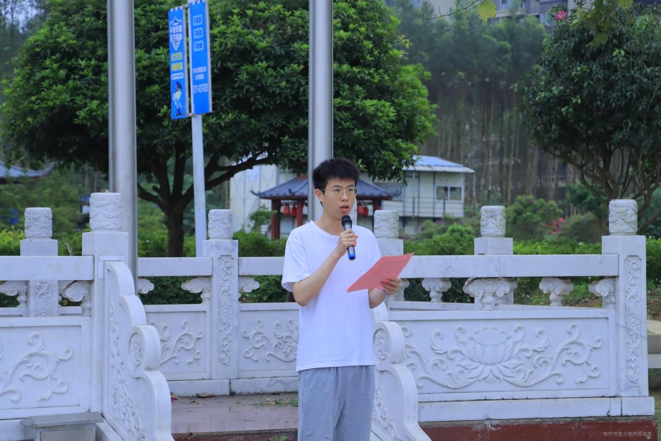 学院团委学生副书记沈世尹在国旗下倡议。他表示,身为大学生应准确把握好努力学习、刻苦钻研的首要任务,努力提高遵纪守法的主动性、自觉性以及安全防范能力,时刻将维护国家安全的信念牢记心中,将习近平法治思想内化于心、外化于行,严守中国立场,以实际行动捍卫国家安全。