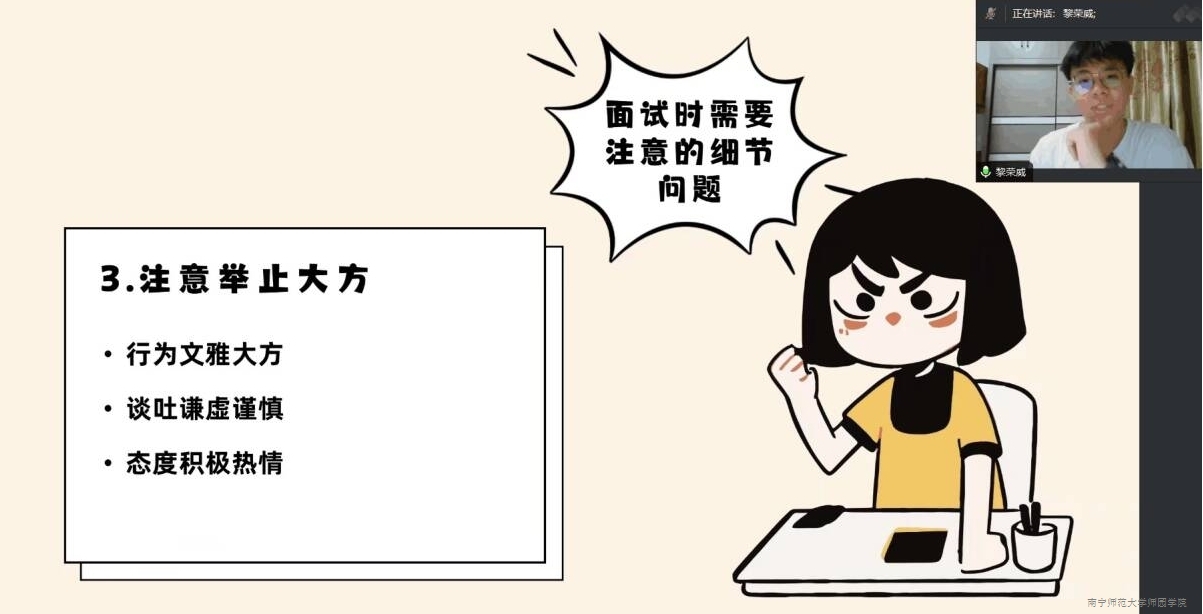 黎荣威同学围绕面试前需要做的准备工作、面试时需要注意的细节问题、面试过程中如何与面试官沟通交流等方面进行分享,并认真解答2021级同学有关实习面试的各类问题,帮助同学们更好地了解职场,顺利开展毕业实习工作。