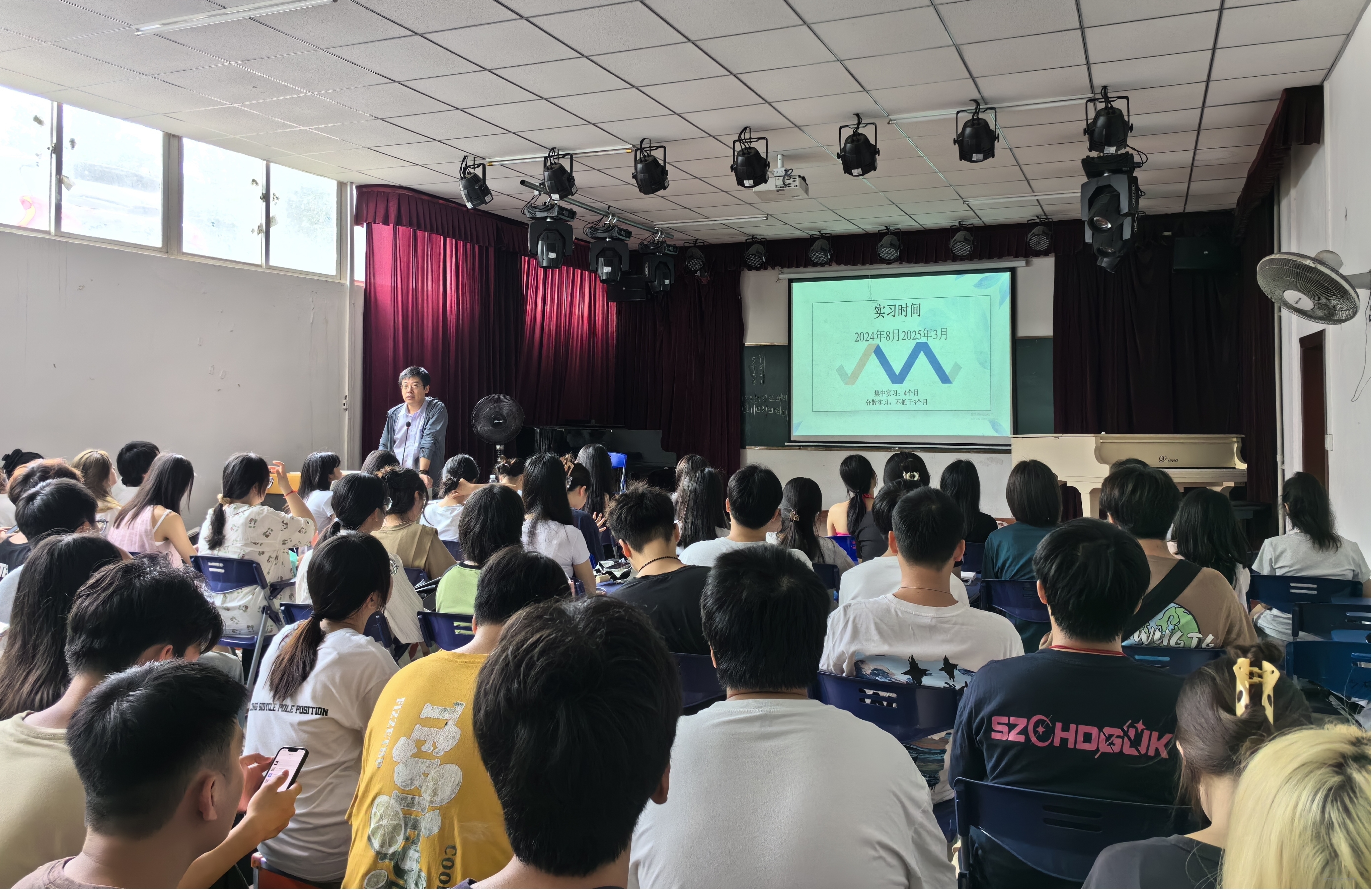 青春的步伐铿锵有力,实践的号角已然吹响。为进一步加强实践教学,提高学生专业素养和就业竞争力,6月5日上午,艺术系在教学楼8栋105教室召开2021级学生毕业实习动员大会。艺术系主任韩聪与2021级全体学生参加会议。