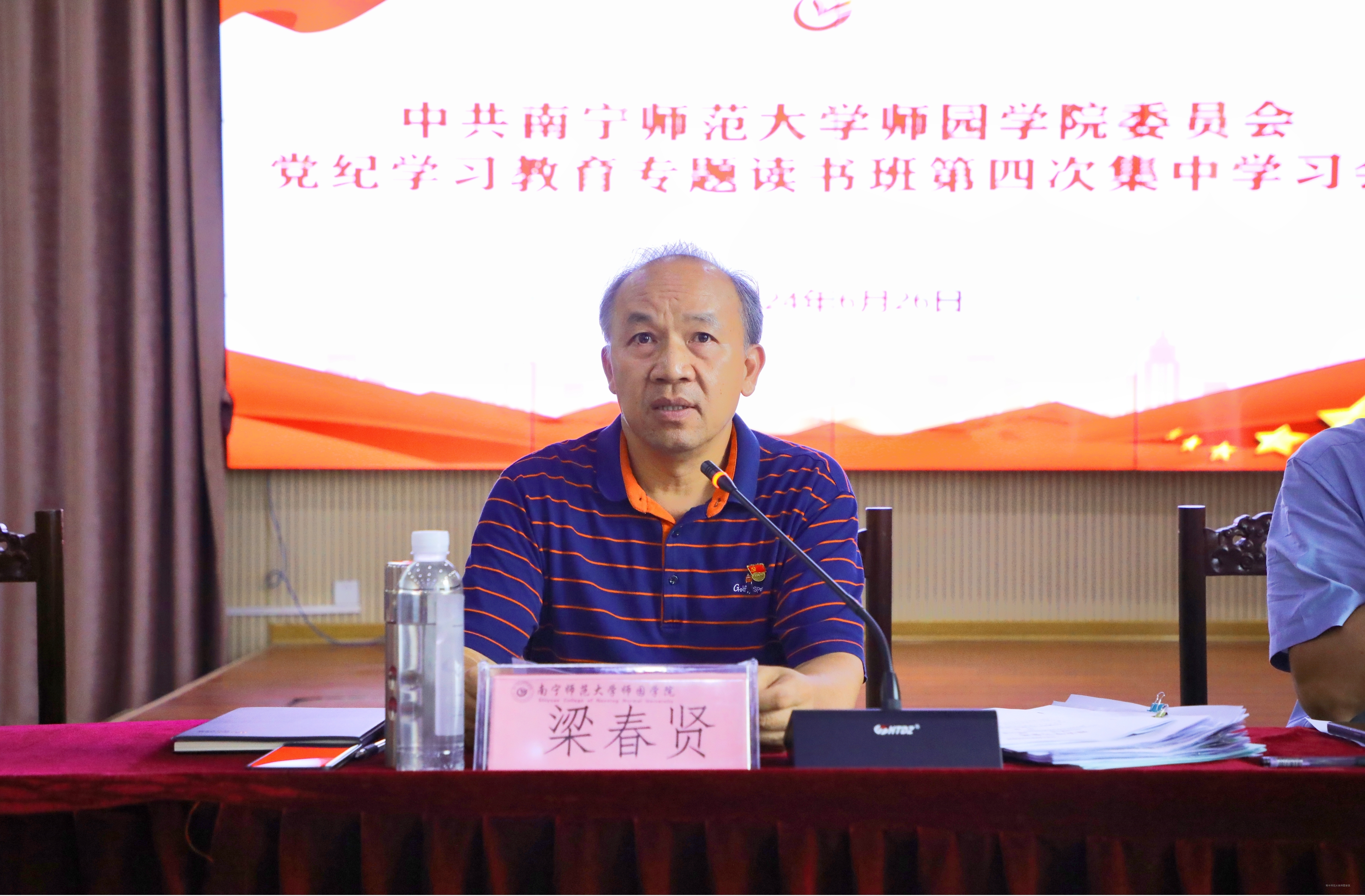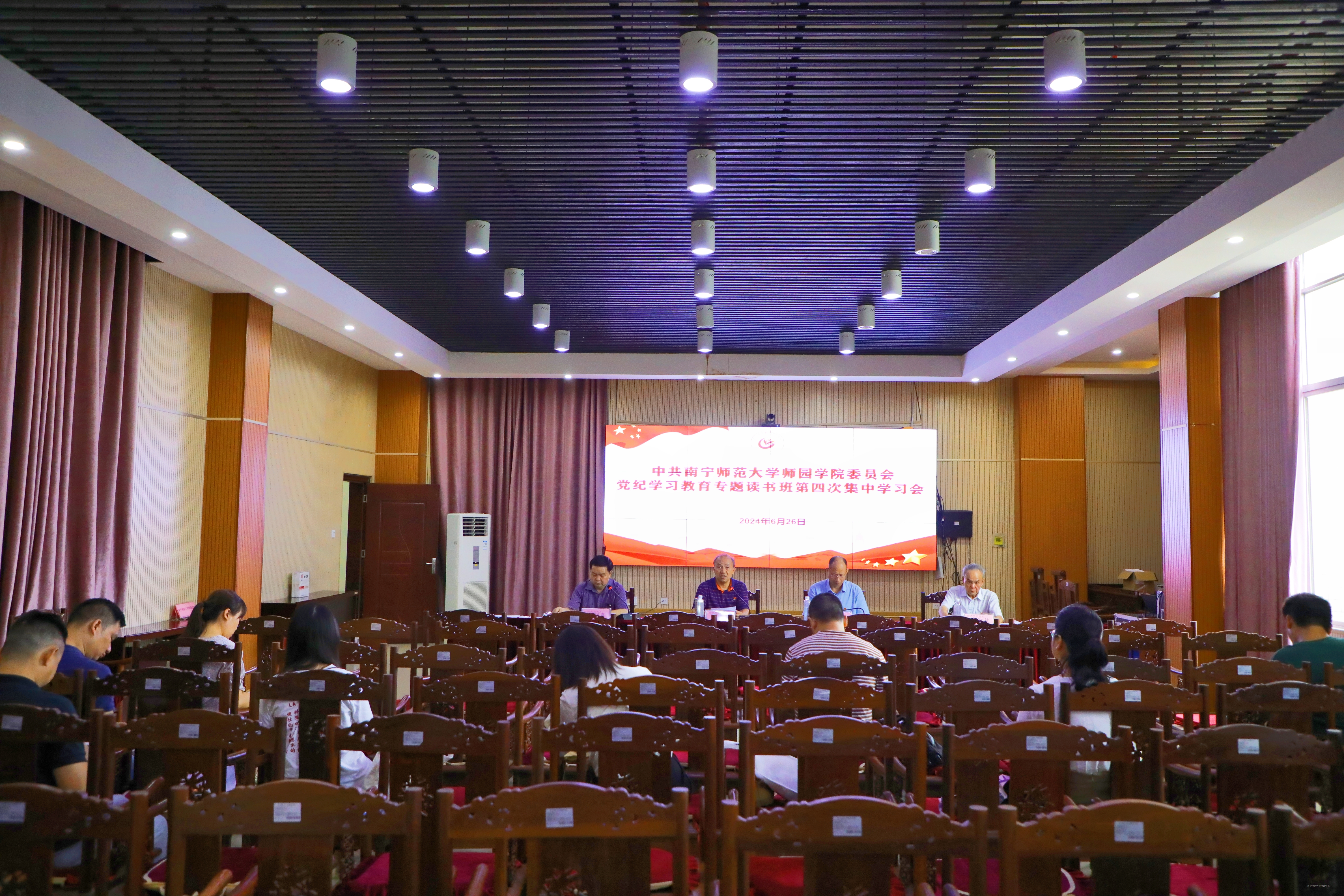 为深入学习贯彻习近平总书记关于全面加强党的纪律建设的重要论述,6月26日下午,我院党纪学习教育专题读书班第四次集中学习会议在行政综合楼12第三报告厅召开。学院党委书记梁春贤,院长尹文嘉,党委副书记、常务副院长李剑喜,教学总督导卢敏秋与各党总支书记、直属党支部书记参加会议。会议由学院党委副书记、常务副院长李剑喜主持。
