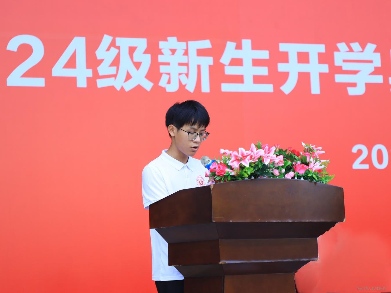 经管系财务管理专业2401班马文浩同学作为参训学生代表发言,庄严承诺将严格遵守军训安排,自律进行各项训练,主动发扬拼搏向上、吃苦耐劳、克服困难的良好品质,让青春在磨炼中进步。