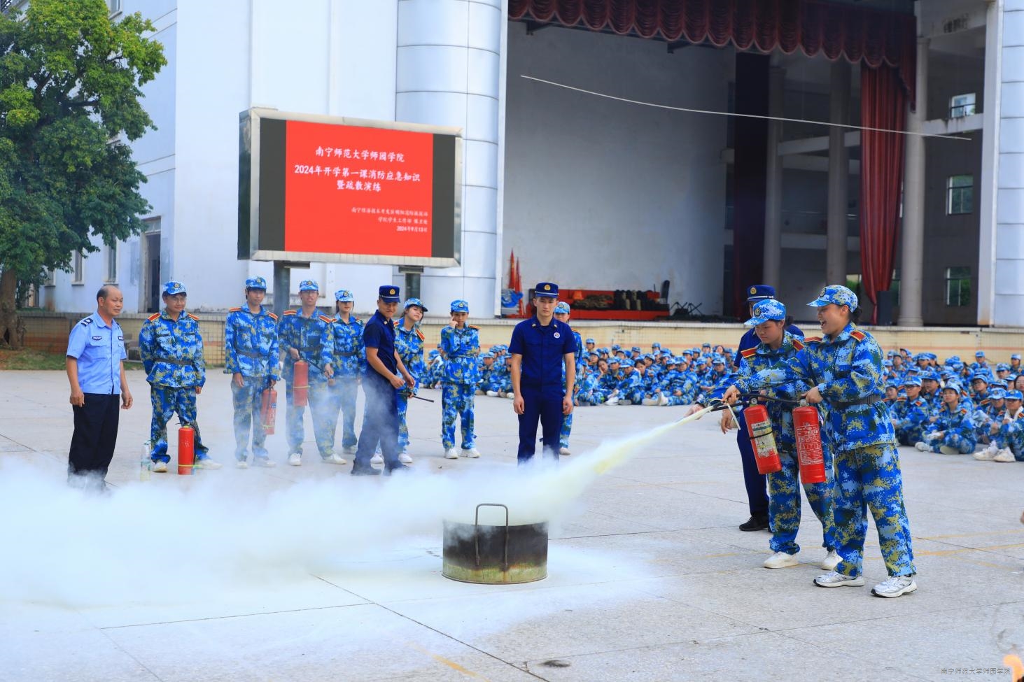 安全疏散演练结束后,为进一步巩固消防安全教育成果,学院还组织2024级新生开展了灭火训练。同学们在南宁经济技术开发区明阳消防救援站队员的指导下,认真遵照提灭火器、拔保险、压手柄、对准火源根部等操作要素,体验了使用灭火器“灭火”全过程,做到掌握正确规范使用灭火器的方法与动作要领,提升避险自救能力。