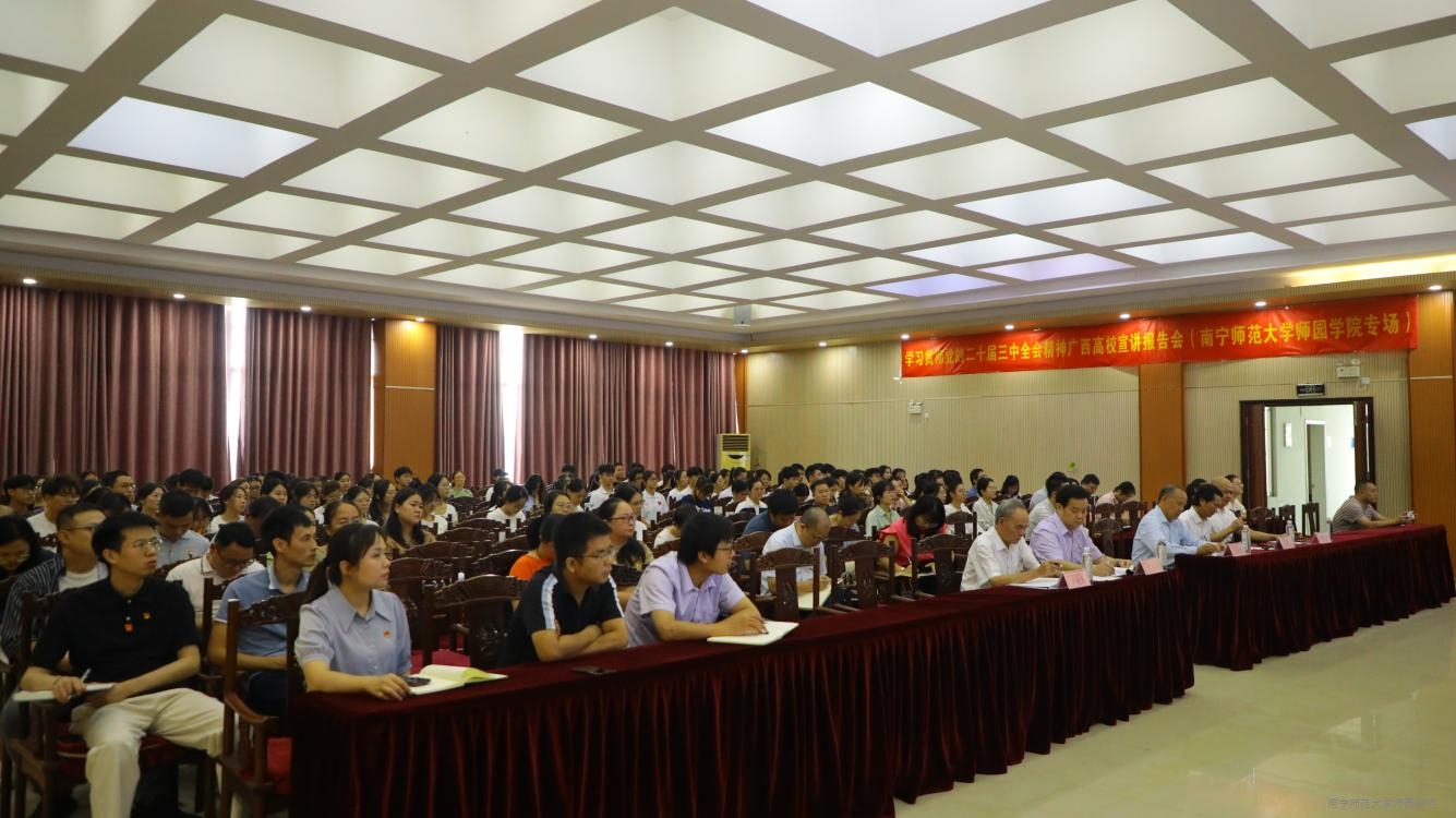 9月24日上午,学习贯彻党的二十届三中全会精神自治区党委讲师团特聘教授(专家)宣讲报告会(beat365官方网站专场)在我院行政综合楼12楼第二报告厅举行。自治区党委讲师团特聘教授、广西警察学院党委副书记、校长张军作宣讲报告。全体学院领导、各中层领导、各级党组织领导、师生党员共同参会。报告会由学院党委书记梁春贤主持。