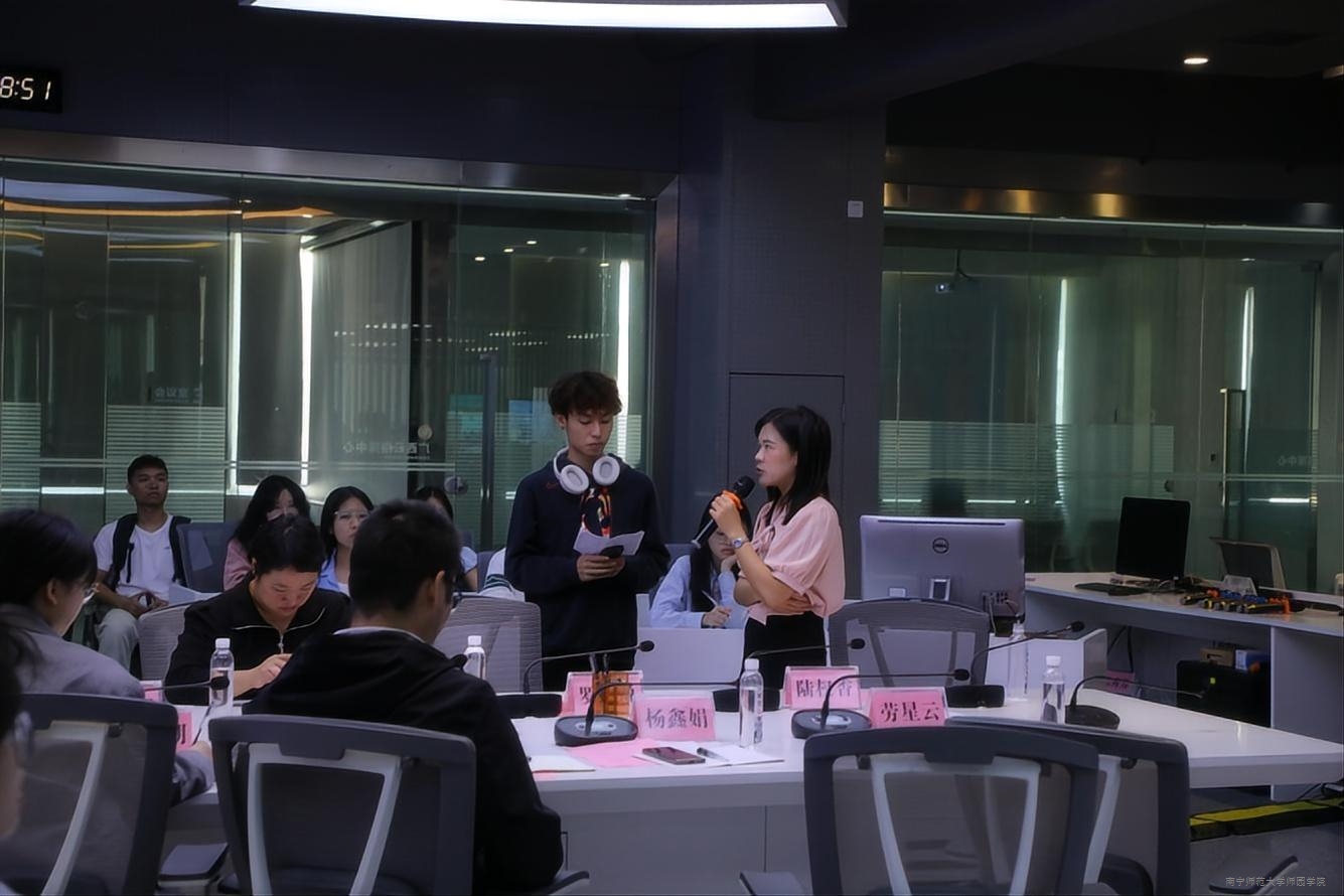 参观结束之后,学院师生与广西云领导干部在指挥中心开展座谈交流。党政事务部周冬生主任对广西云领导干部的热情接待表示感谢,并详细介绍了学院发展历程、办学特色、专业建设成果及防城港新校区建设情况,希望双方加强交流合作,协同推进专业人才培养,提升人才培养质量。罗锐总编辑对学院师生的到来表示欢迎,并详细介绍了广西云数字媒体集团的组织架构、业务范围、媒体矩阵,鼓励同学们强化掌握专业理论知识,加强实践锻炼,提升专业技能,为高质量就业夯实基础。随后,视听传播中心、融媒精品工作室相关负责人分别介绍了广西云数字媒体集团策划、制作的精品融媒体作品,重点分享了《爱上非遗 “桂”在传承》《提振经济 他们这样干》《漫视界》《有料AI》等特色新闻作品、栏目的策划切入点和执行要求,让同学们学习新闻策划的方向、切入点与注意事项,领会AI、VR等现代科技在新闻宣传中的实际应用,感受媒体与现代科技融合的魅力。在交流环节,同学们踊跃提问,积极与广西云数字媒体集团的领导干部交流学习,加深对传媒行业的认识并明确自身应如何主动适应全媒体发展时代,提升专业能力素养与技能。