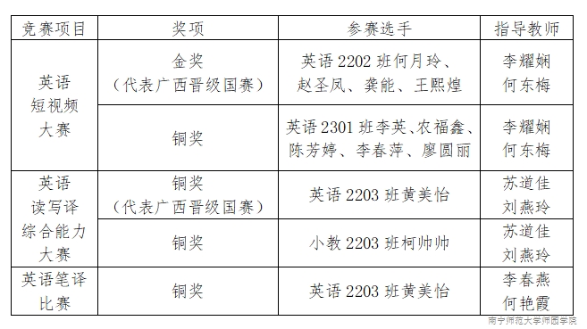 经过激烈的角逐,我院参赛选手和英语短视频作品在众多竞争对手中脱颖而出,荣获英语短视频大赛金奖1项、铜奖1项;英语读写译综合能力大赛铜奖2项;英语笔译大赛铜奖1项。其中,荣获英语短视频大赛金奖的《The Digital China-Fahai Temple》作品和荣获英语读写译综合能力大赛铜奖的英语2203班黄美怡分别代表广西晋级国赛。