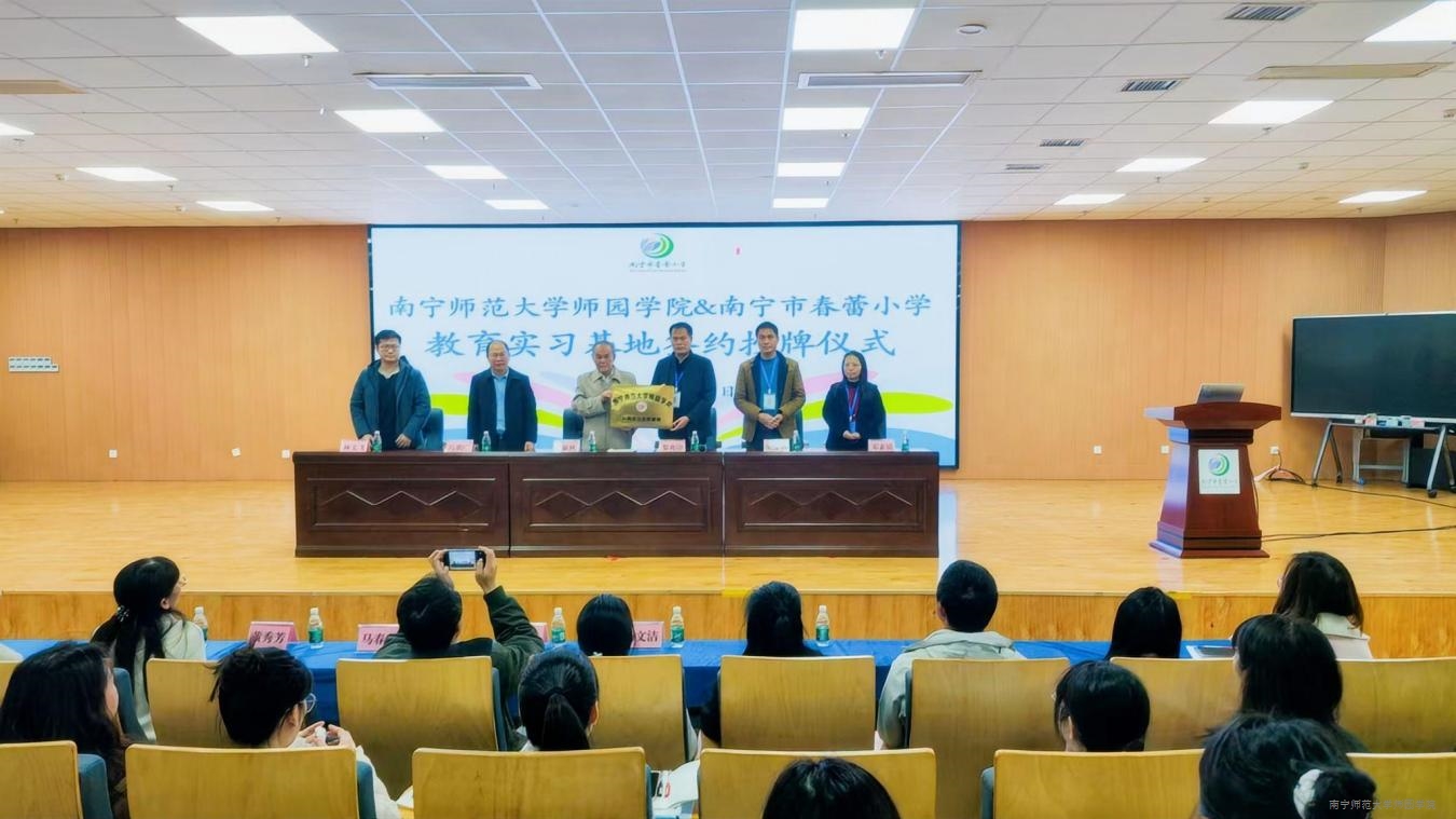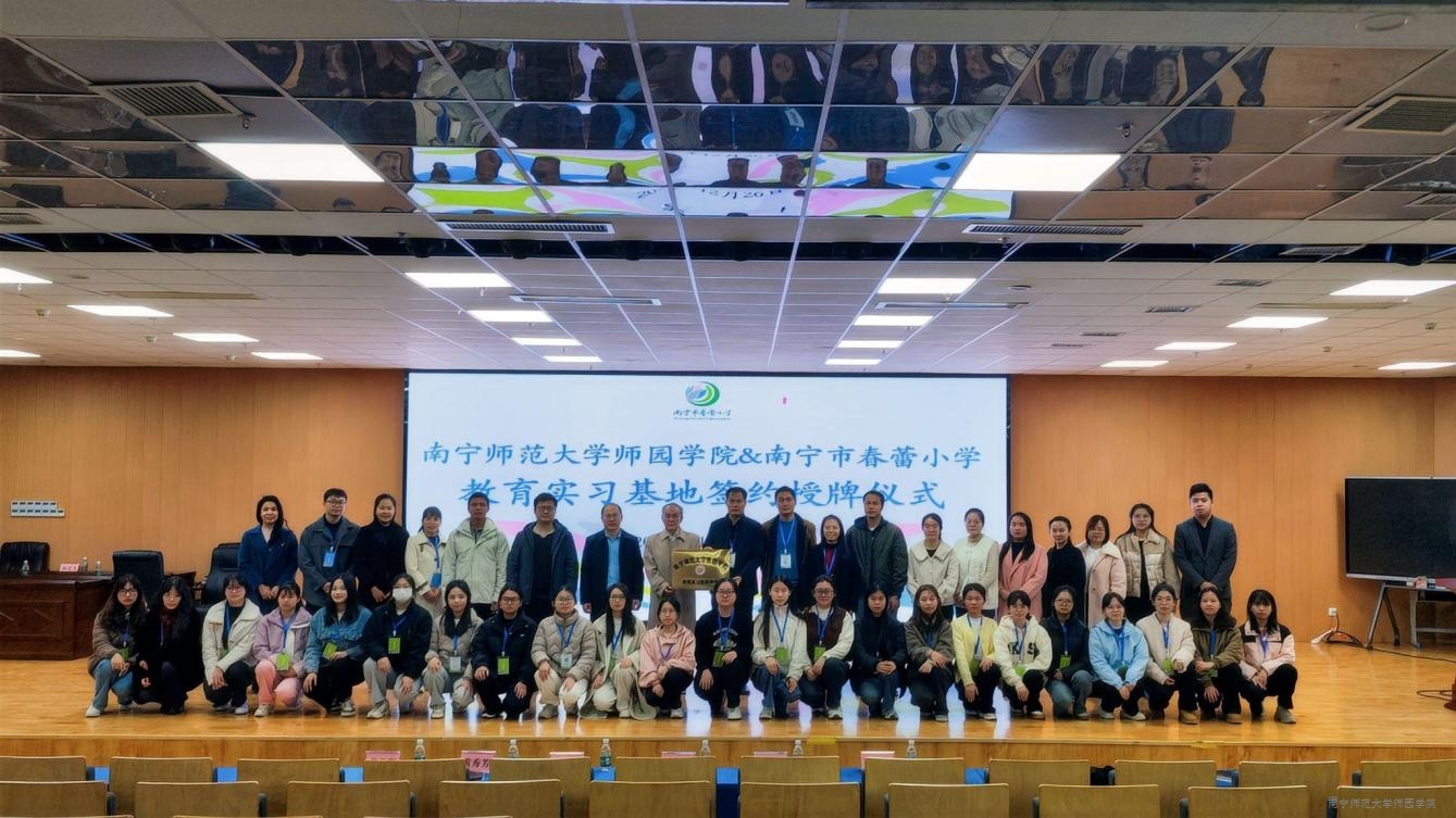 为进一步优化教育资源配置,加强校校合作,推进学院应用型人才培养工作,12月26日上午,学院与南宁市春蕾小学正式签署教育实习实践基地合作协议并举行授牌仪式。学院教学总督导卢敏秋率教育系主任冯朝广等一行人前往南宁市春蕾小学,与该校校长黎兆印、副校长梁光彩、邓素娇及我院2021级小学教育专业实习学生代表共同见证了这一重要时刻。