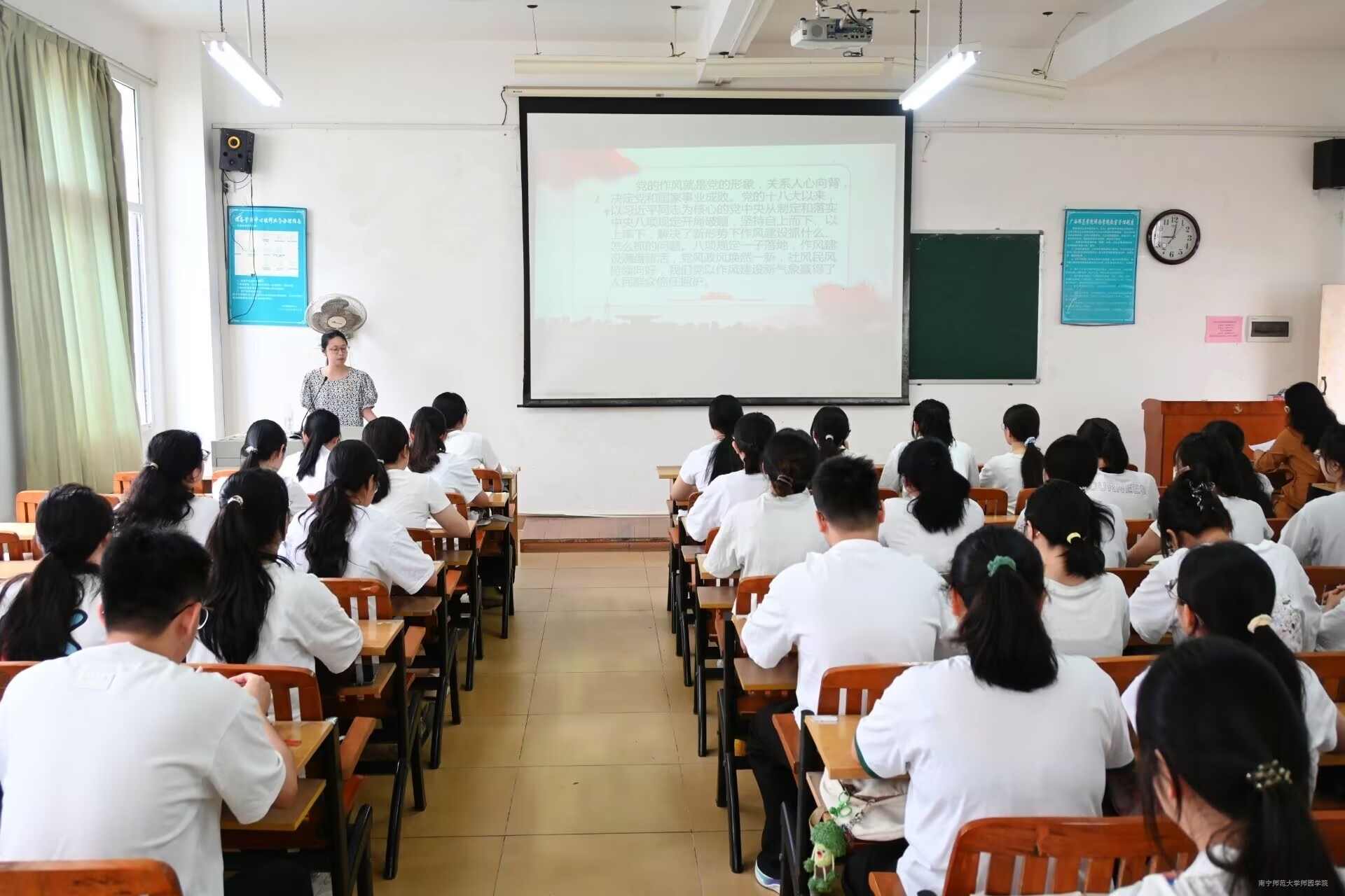 为学习习近平总书记关于深入贯彻中央八项规定精神学习教育的重要讲话和重要指示精神,4月25日上午,中文系学生党支部在教学楼3-302教室开展“清廉守正担使命,砥砺奋进铸忠诚”主题深入贯彻中央八项规定精神学习教育专题党课。本次党课由学生党支部书记龚今惠主讲,中文系党总支书记潘美益、全体学生党员参加党课学习。