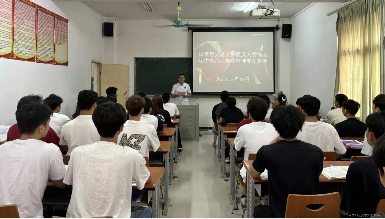 邓朝同志以《坚持自我革命,持续推进党的作风建设》为主题,围绕深入贯彻中央八项规定精神学习教育展开系统阐述。他指出,深入贯彻中央八项规定精神学习教育是全面从严治党的战略部署、党的自我革命实践,体育系党员师生要时刻保持清醒头脑,筑牢思想防线,严守党的纪律规矩,做到知敬畏、存戒惧、守底线。此外,邓朝同志还结合体育系实际,通过典型案例分析作风建设重要性,强化警示教育,强调体育系党员师生要将深入贯彻中央八项规定精神作为政治任务,强化纪律规矩意识,将中央八项规定精神内化于心、外化于行,不断提升自身的思想政治素质和业务能力,为体育系的发展贡献自己的力量。