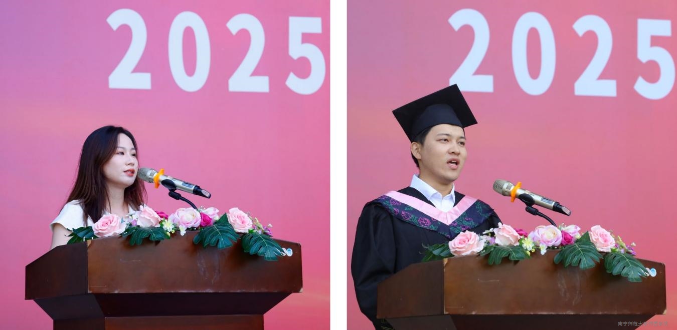 艺术系黎依婷老师作为教师代表发言,叮嘱学生们以奋进姿态直面挑战,坚持终身学习,做到知行合一,勇担时代使命,融入国家发展大局,愿同学们践行“厚德博学 尚美笃行”的校训,做新时代奋斗青年,奔赴远大前程!来自外语系英语2102班的蒋俊带着荣幸与激动代表2025届毕业生发言,认真回顾了大学四年课堂求知、社团实践、竞赛拼搏的经历,表达对师长同窗的感恩并带领全体同学向老师们行谢师礼。同时他向全体毕业生倡议,要以高尚的品德立身,以广博的学识立业,以务实的态度做事,以笃行的精神追梦。