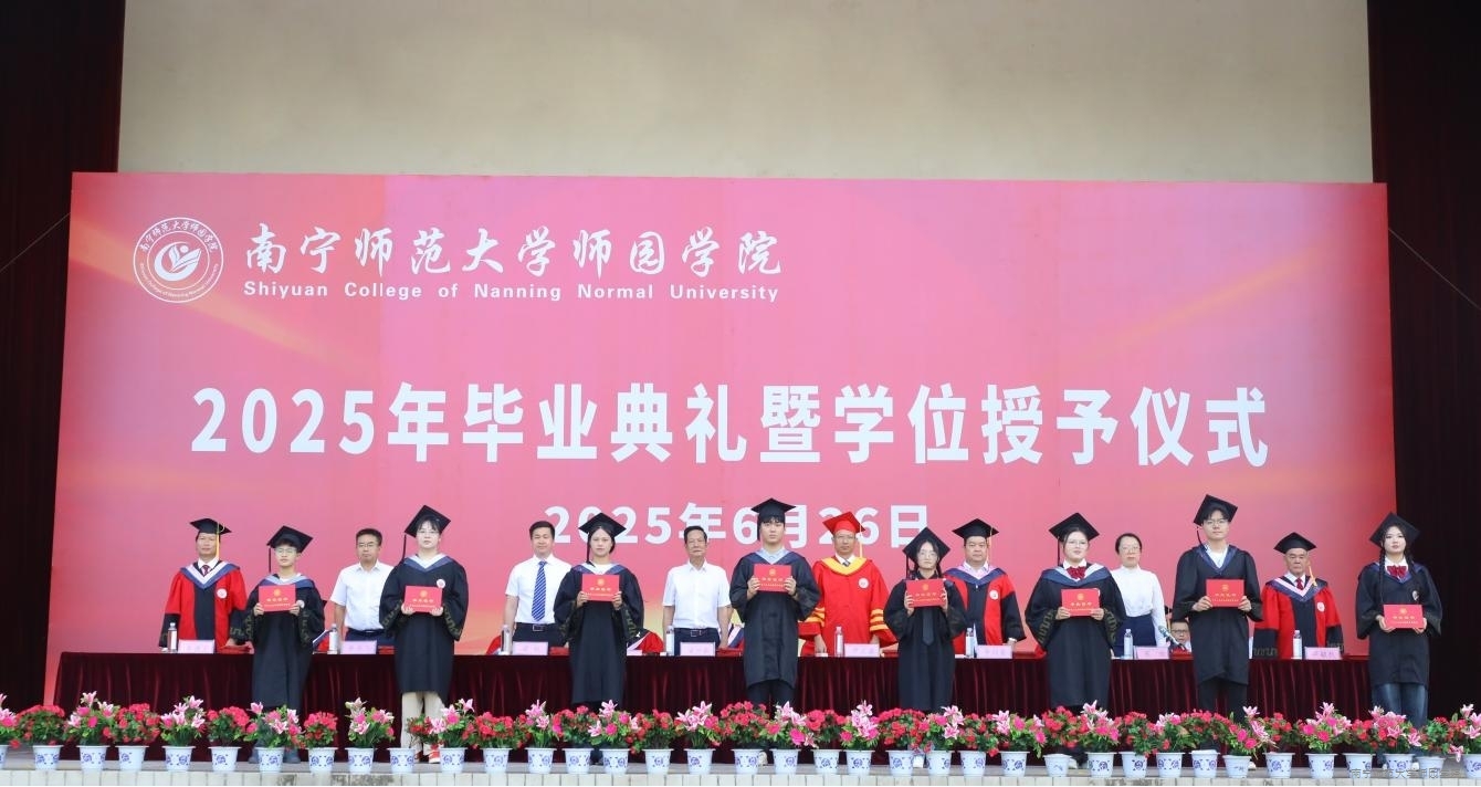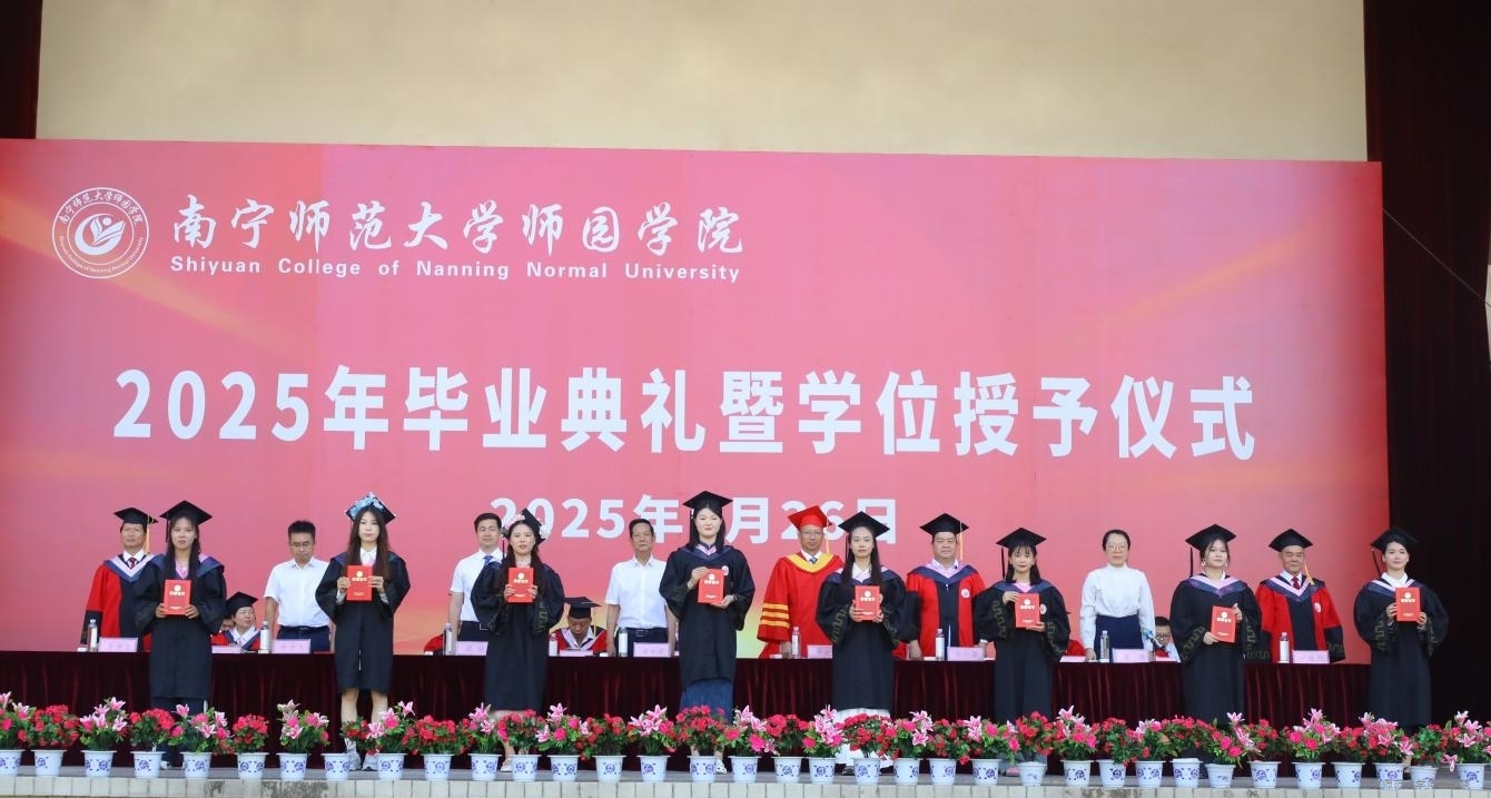 尹文嘉院长为典礼发表致辞,对圆满完成学业的同学们表示热烈的祝贺,并带领全体毕业生们共同回顾了师园学院的四年来在防城港新校区建设、学科建设、学科竞赛、招生就业、大学生志愿服务等方面取得的优异成绩。四载砥砺,今朝学成启程,对于即将踏上新征程的毕业生,尹文嘉院长献上真挚的祝贺与殷切的期望,鼓励2025届毕业生们勇担历史使命,与时代发展同频共振: