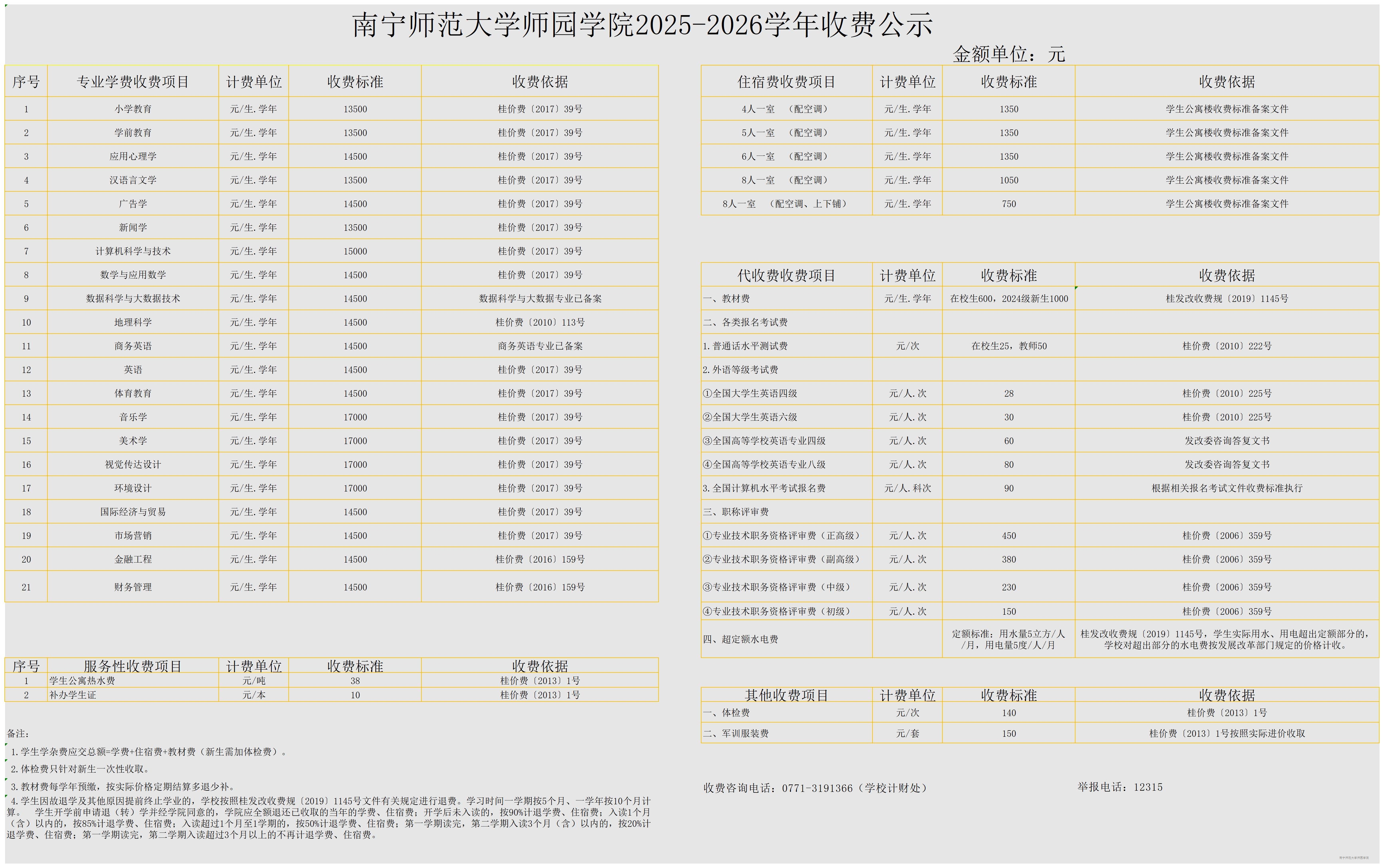 beat365官方网站2025-2026学年收费公示