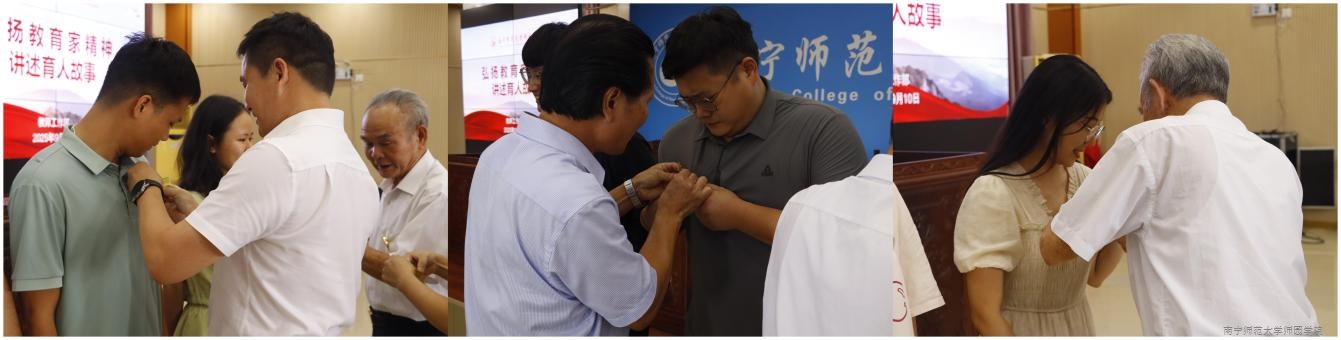 随后,覃卫媛、李芬、乔永顺、余斯婷、黄驰5位优秀教师代表依次分享育人故事。他们结合多年教育实践,讲述了扎根讲台的经历,阐释了对教育家精神的理解与践行,引发在场师生强烈共鸣。分享结束后,学校领导为工作满10周年的教师代表颁发“十周年教师”荣誉证书,并为新教师佩戴校徽,既肯定了资深教师的坚守与付出,也寄予新教师扎根教育、成长成才的期望。