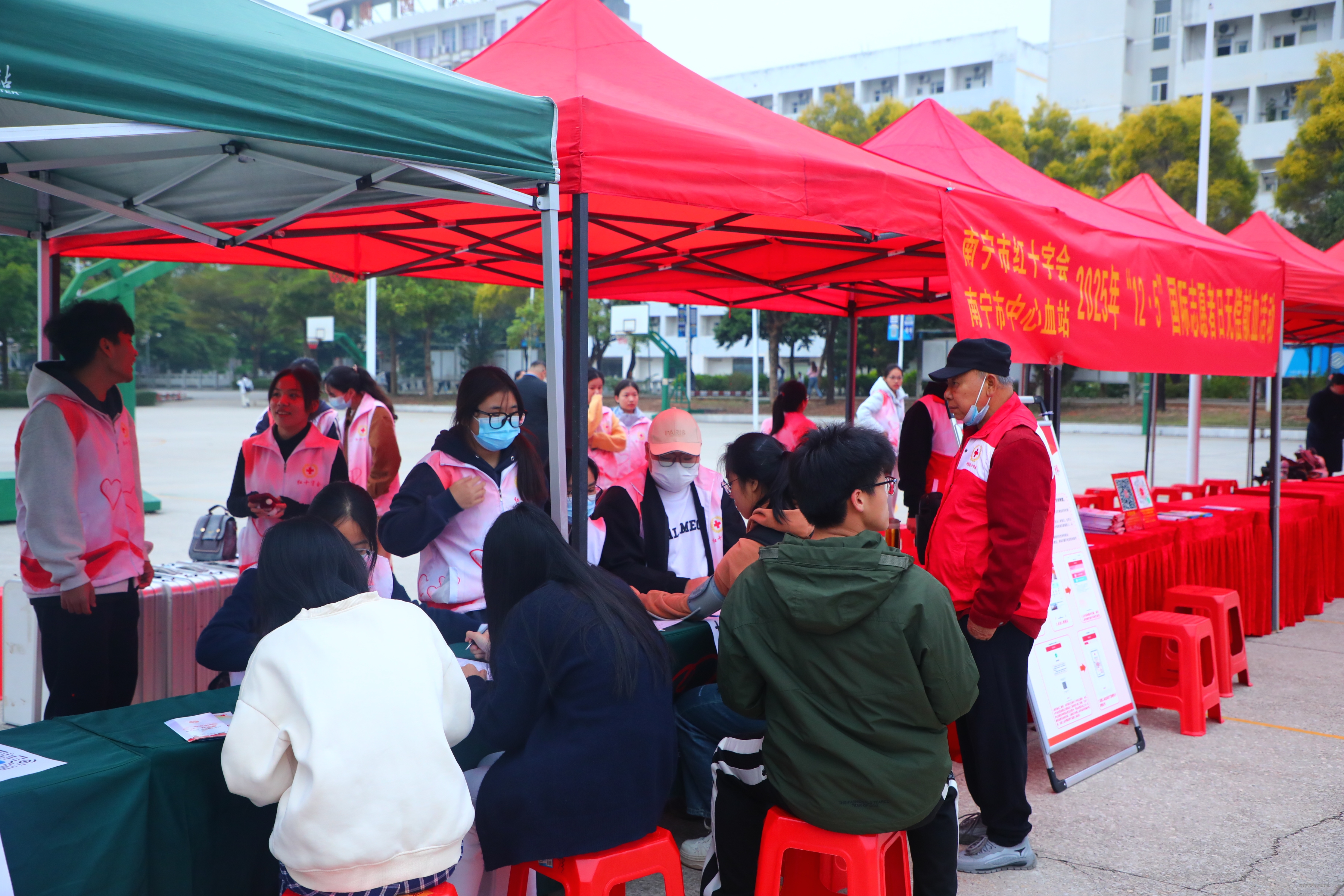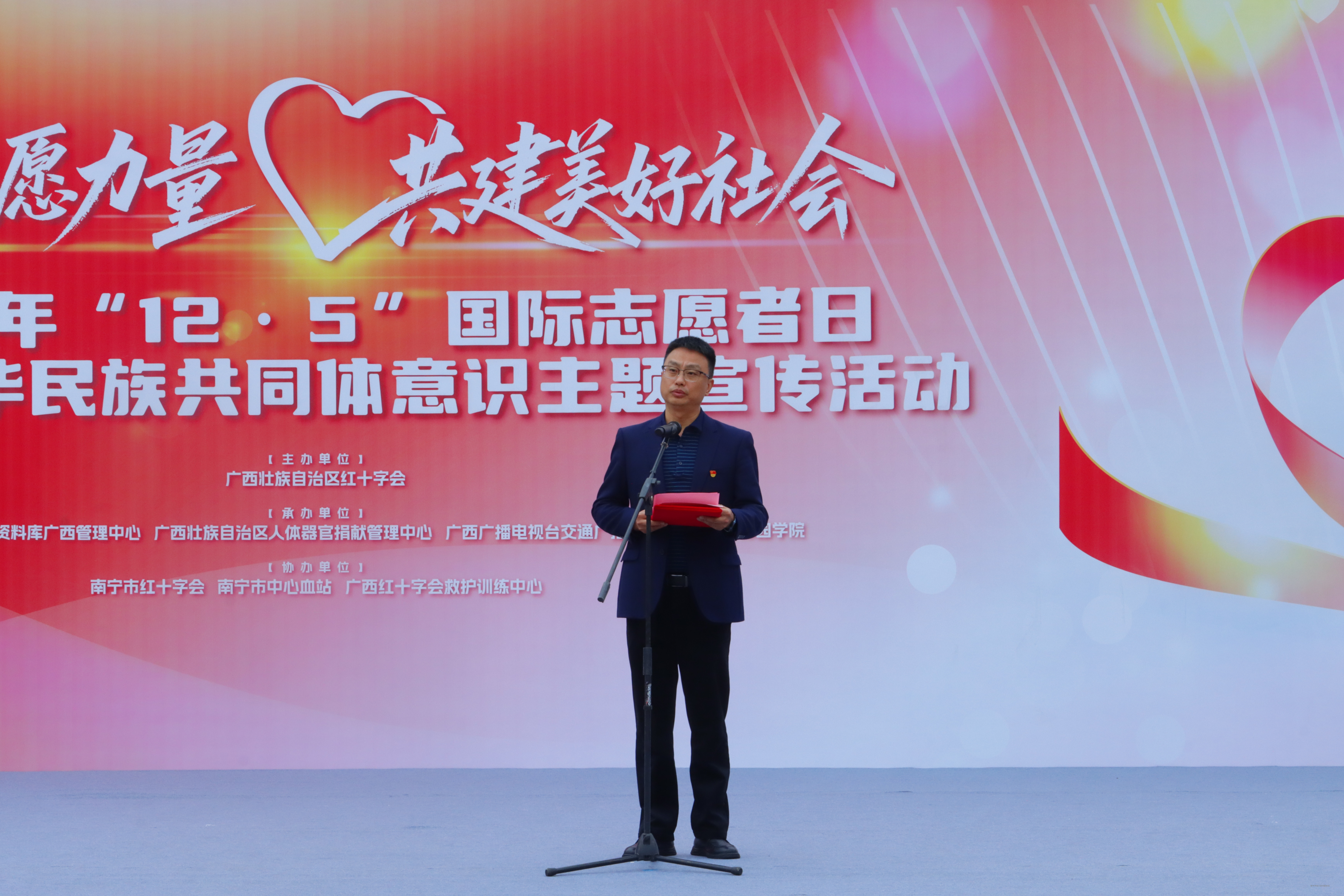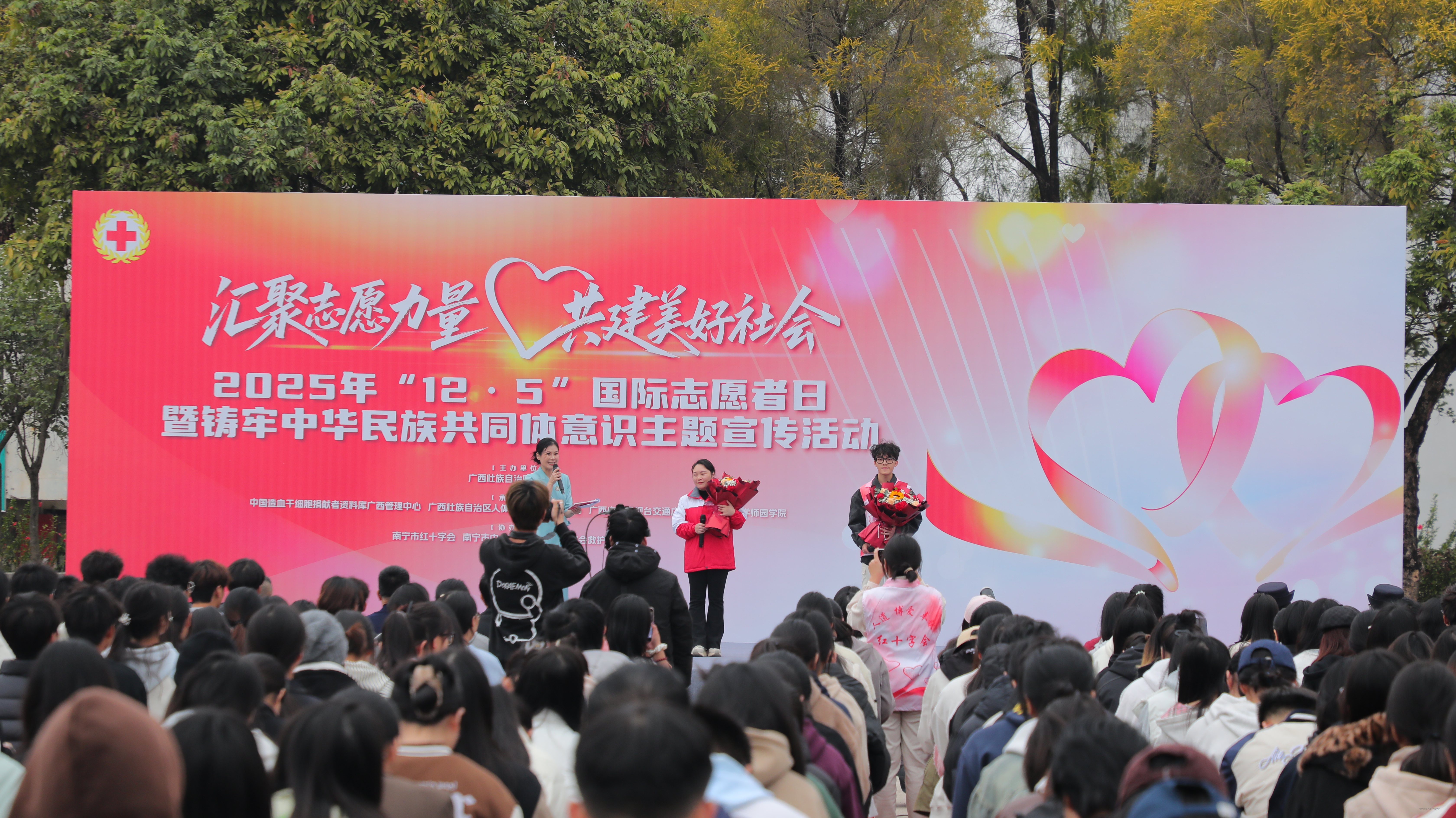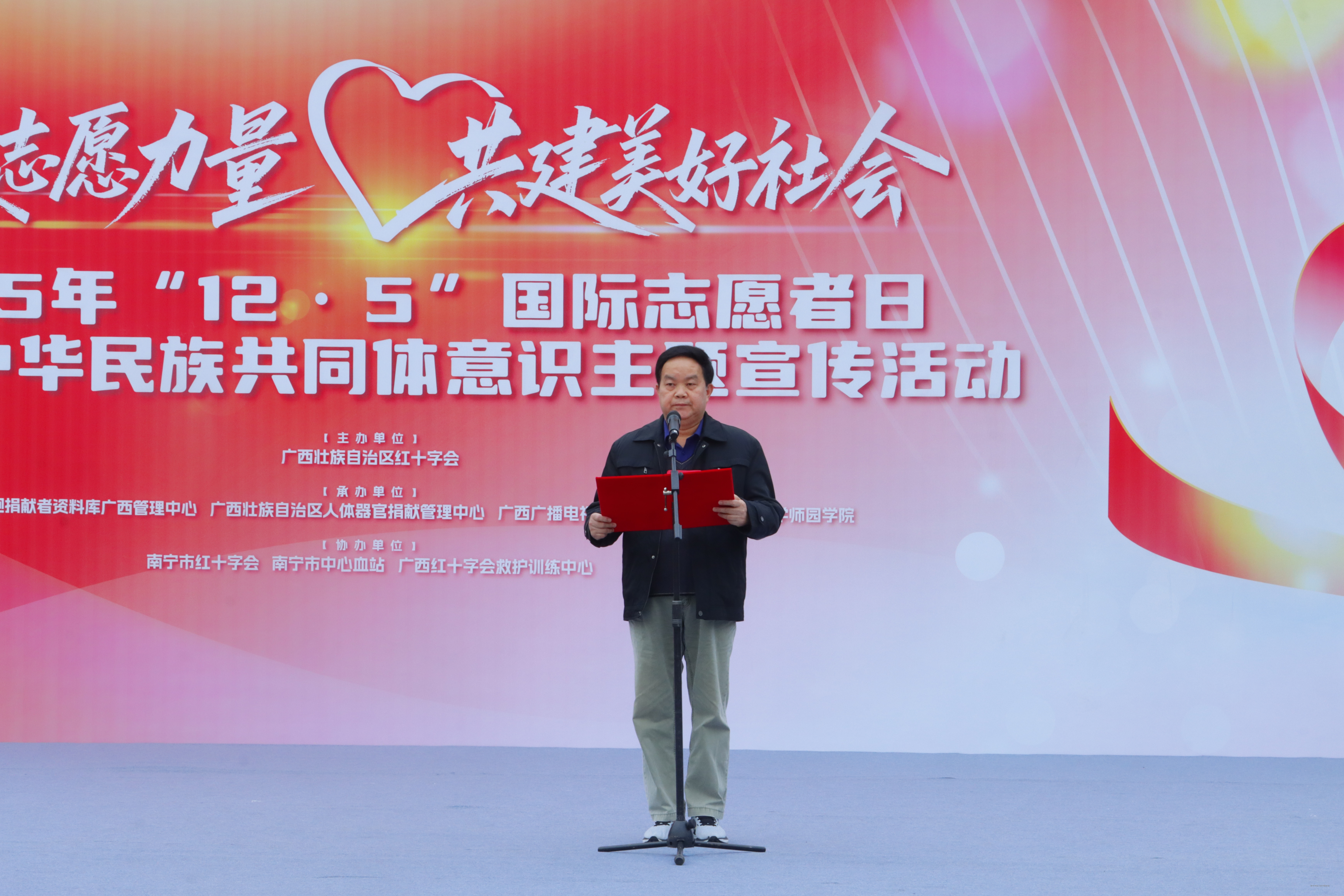 为深入贯彻落实党的二十届四中全会精神,大力弘扬志愿服务精神,12月5日,正值第40个“国际志愿者日”,beat365在升旗广场举行“汇聚志愿力量,共建美好社会”2025年“12·5”国际志愿者日主题宣传活动。自治区红十字会党组成员、副会长兼秘书长吴强,学校党委副书记、常务副校长李剑喜出席活动并致辞,学校师生、志愿者代表约500人共同参加本次活动。