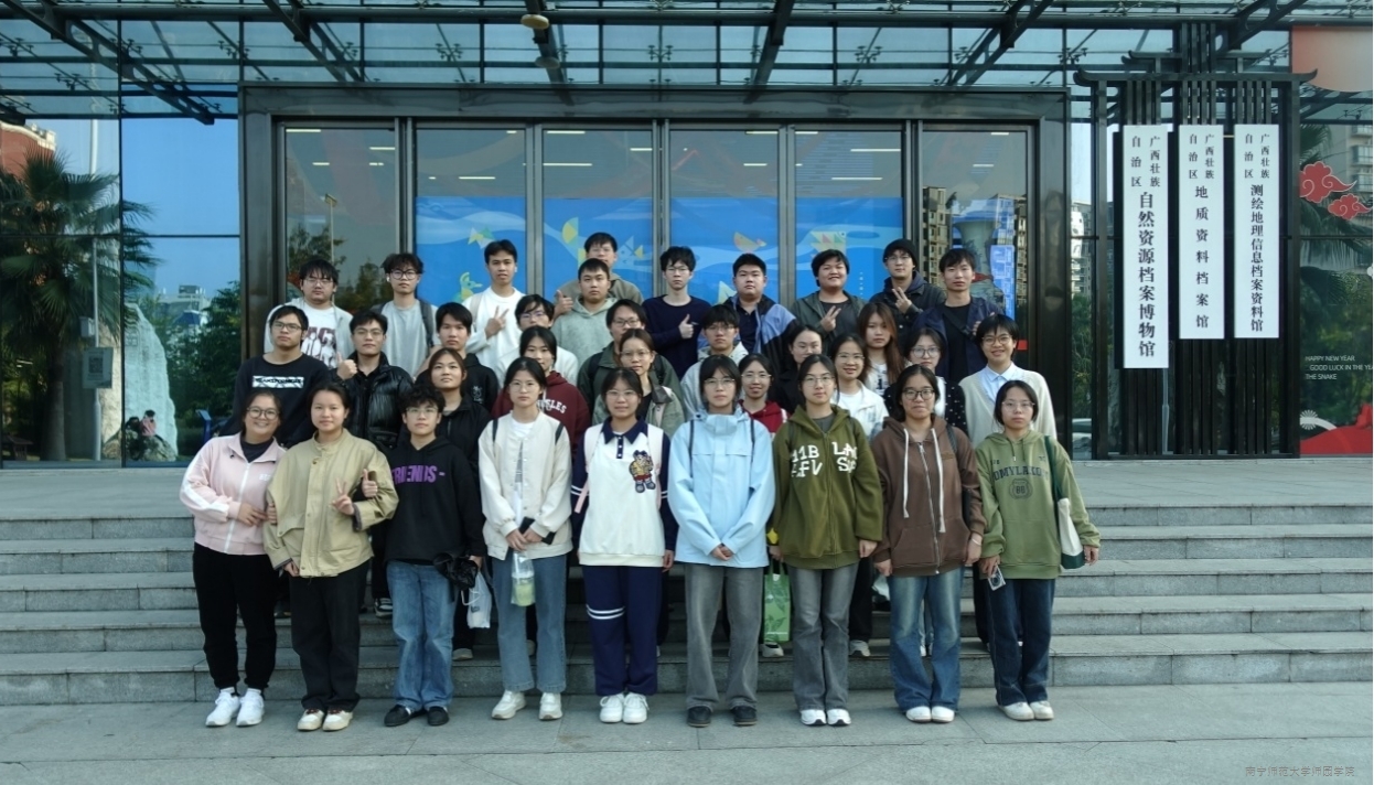 随后,师生前往广西自然资源博物馆,参观了矿物岩石、古生物化石、广西地理地质以及测绘科技等主题展厅。馆内丰富的标本、模型和互动展示,系统呈现了地球演化历程与广西自然资源特点,帮助同学们拓宽了地学视野,增强了对自然地理、地质学等相关知识的直观认知。
