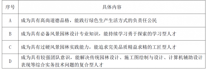 人才培养目标:本专业培养理想信念坚定、志向远大,崇尚绿色发展理念,德智体美劳全面发展,具有一定的科学文化水平,良好的人文素养、职业道德和创新意识,精益求精的工匠精神,较强的就业能力和可持续发展的能力;掌握本专业风景园林设计、园林计算机辅助设计、园林工程项目管理等知识和技术技能,面向风景园林专业的景观设计师助理、风景园林工程技术人员等职业群,能够从事传统园林设计、风景园林工程施工与管理、园林施工图设计等工作的高素质技术技能人才。本专业学生在毕业后3-5年预期能达到的目标见下表。