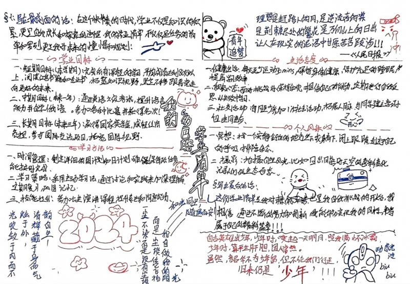 本次活动自启动以来,24级同学们积极响应,结合自身专业与课程特色,热情投身于学业目标的规划之中。他们以图文并茂的形式,创造性地展示了各自独特的“学业蓝图”,不仅展现了思维的活跃与深度,更在构思与创作的过程中,加深了对学业规划的理解,明确了前行的方向。同学们在思维的碰撞中激发出无限憧憬与希望,学业规划逐渐清晰,目标愈发坚定。他们将以“勤学善思、学以致用”为指引,于心中播下积极向上的种子,激励自己在探索与实践中不断挖掘潜力,勇敢挑战未知。
