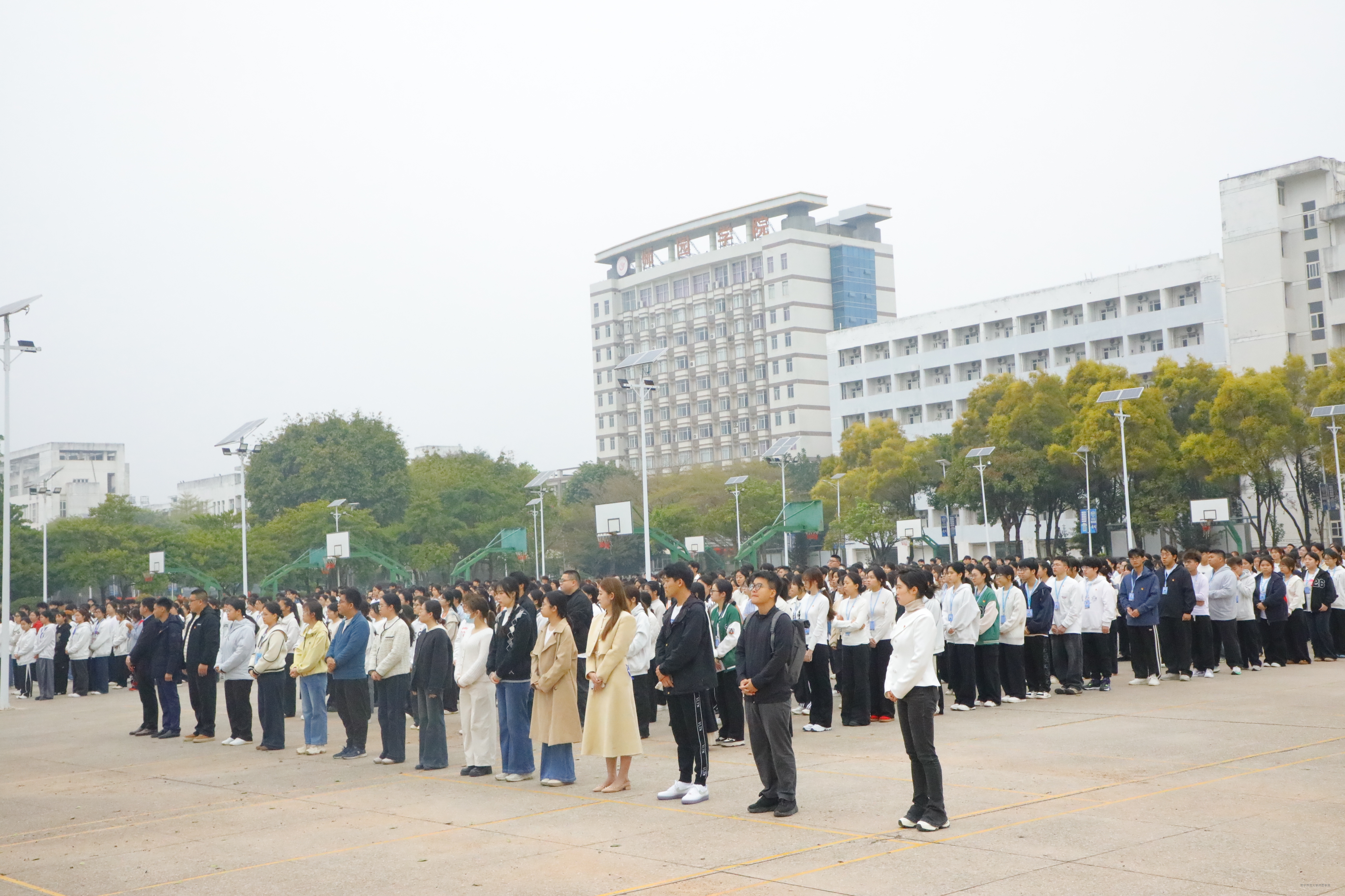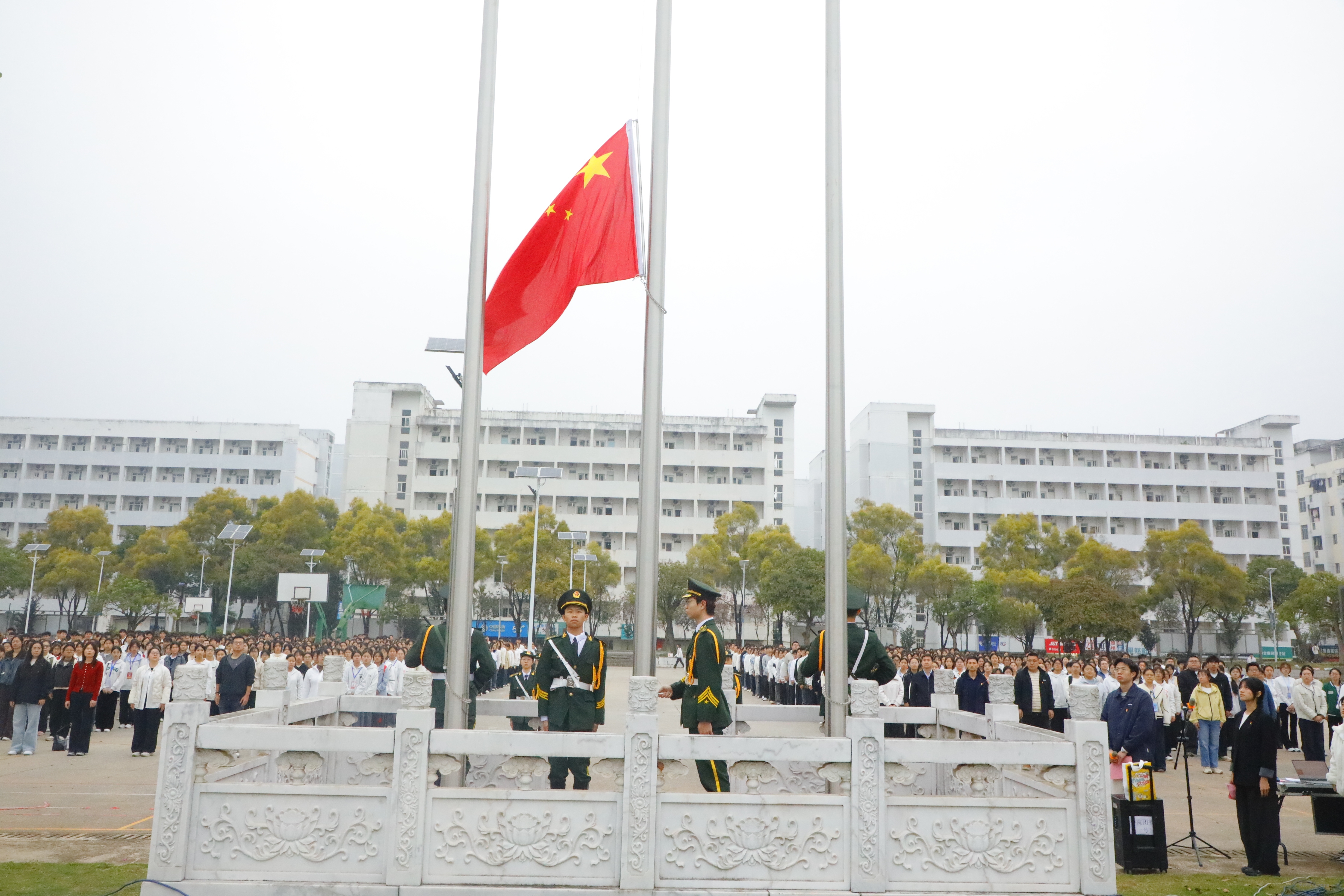 当天清晨,国旗护卫队的旗手们迈着铿锵有力的步伐,护送五星红旗走向升旗台,在激昂的国歌声中五星红旗冉冉升起,全体师生面向国旗庄严肃立,行注目礼。