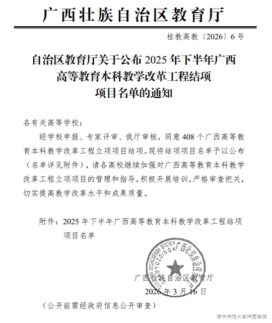 近日,自治区教育厅发布了《自治区教育厅关于公布2025年下半年广西高等教育本科教学改革工程结项项目名单的通知》(桂教高教〔2026〕6号),beat365共有4项广西高等教育本科教学改革工程项目通过结题验收。
